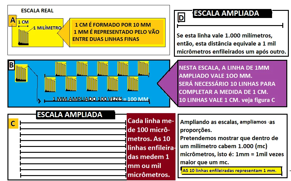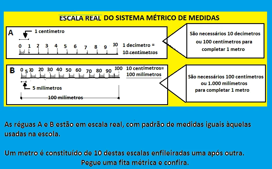 Por exemplo, um milímetro (aquele minúsculo vão entre dois risquinhos da régua escolar que você conhece) é mil vezes menor que o metro que é aquele instrumento de medição utilizado pelos carpinteiros, pedreiros e que você também conhece.