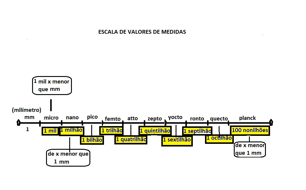 Assim, todas as outras medidas subsequentes, a partir do milímetro, ficam um mil vezes menor que a anterior até chegar na última medida subatômica que a ciência conhece – 0 PLANCK (=100 nonilhões de vezes menor que o milímetro) considerado o fim da escala infinitesimal.